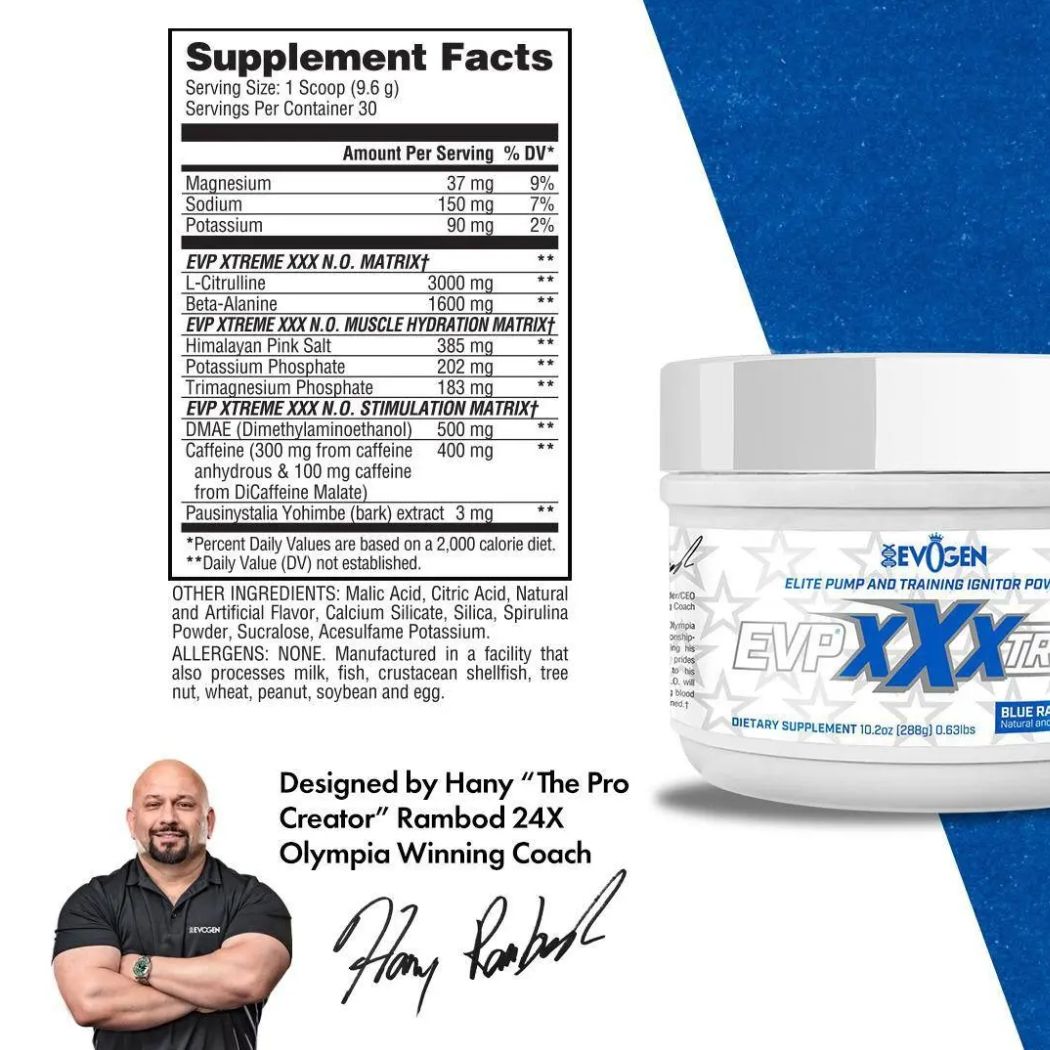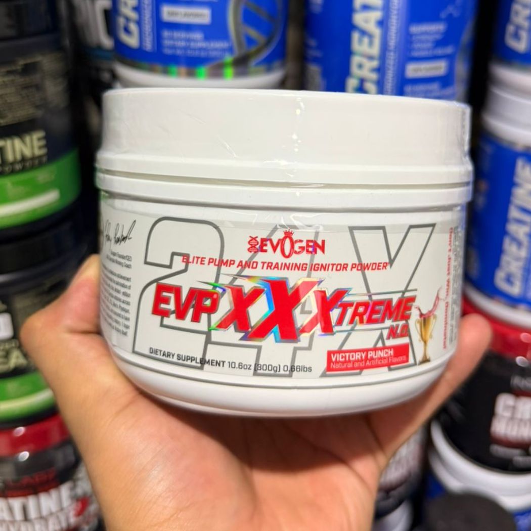 EVP Xxxtreme es un suplemento pre entreno en polvo de Evogen Nutrition, diseñado para acompañar tu rutina antes del ejercicio.