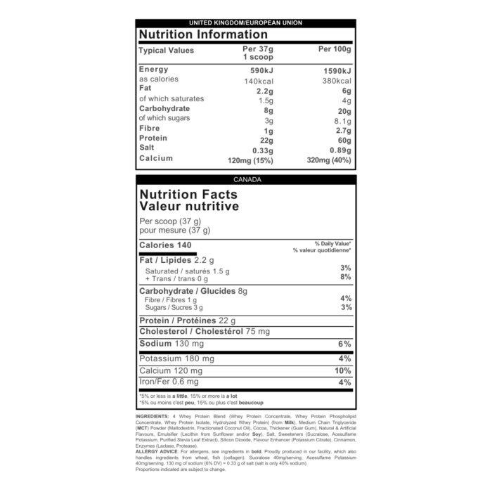 Proteína de suero, concentrado de suero, aislado de proteína, cacao en polvo, lecitina, aromas naturales,